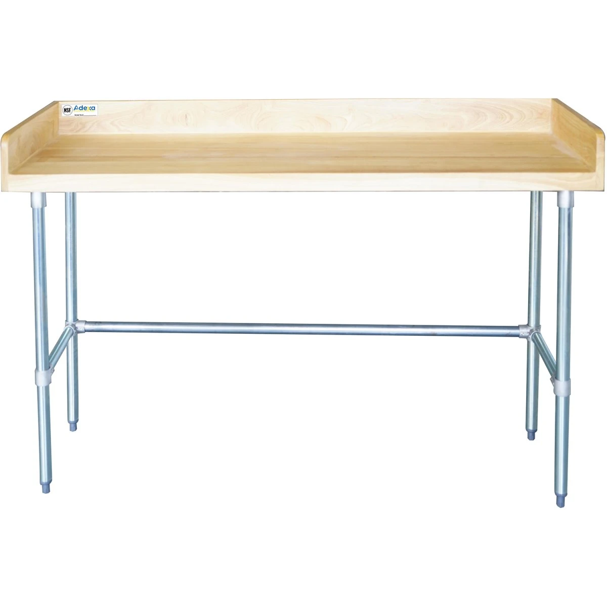 The wood top work table features an open base design for added storage space, and round legs, with adjustable feet for precise leveling makes an ideal work station for the busiest commercial bakeries.