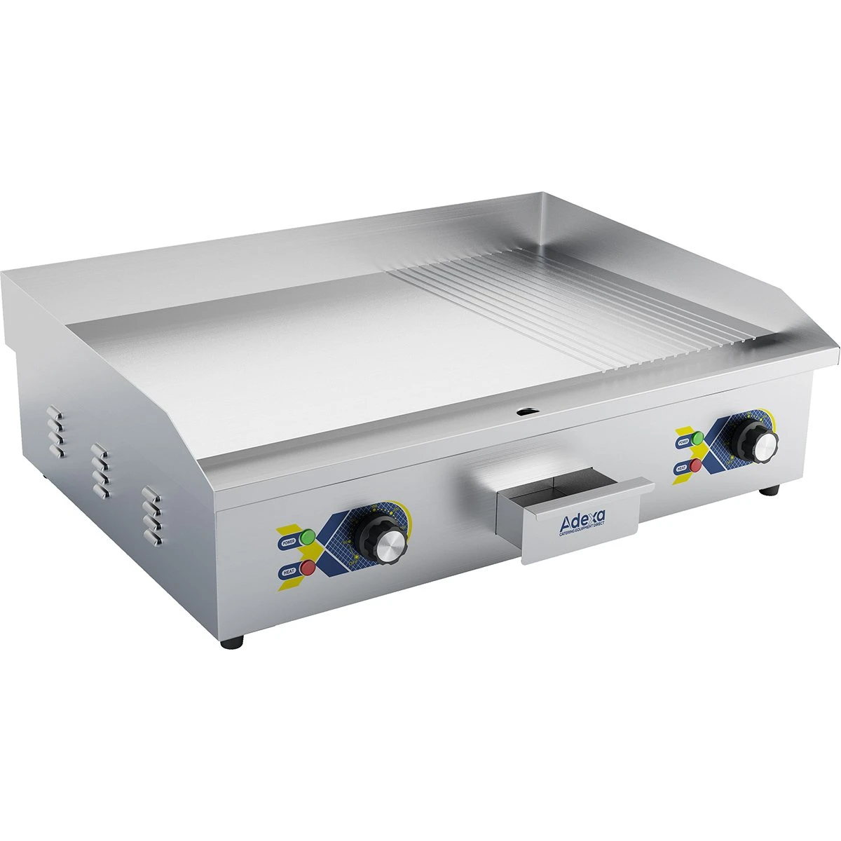 Powerful and reliable, this professional steel griddle features a generously sized steel cooking surface that is both grooved and smooth, perfect for breakfast, lunch or dinner services. The heavy duty elements ensure a rapid heat up and an even spread of heat across the wide griddle surface. With simple dial thermostat control and removable fat collection drawer, the restaurant griddle is incredibly easy to use, clean and maintain. This catering fry top is an incredible bargain at the current discount sale price.