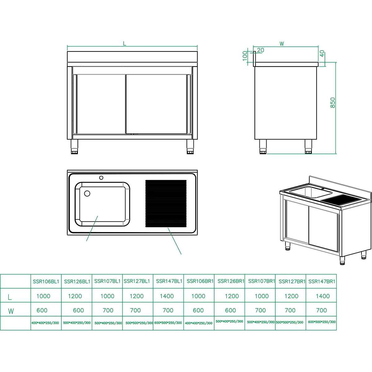 Commercial Sink With Cupboard Stainless Steel 1 Bowl Left Splashback Width 1200mm Depth 700mm | Adexa THSSR127BL1