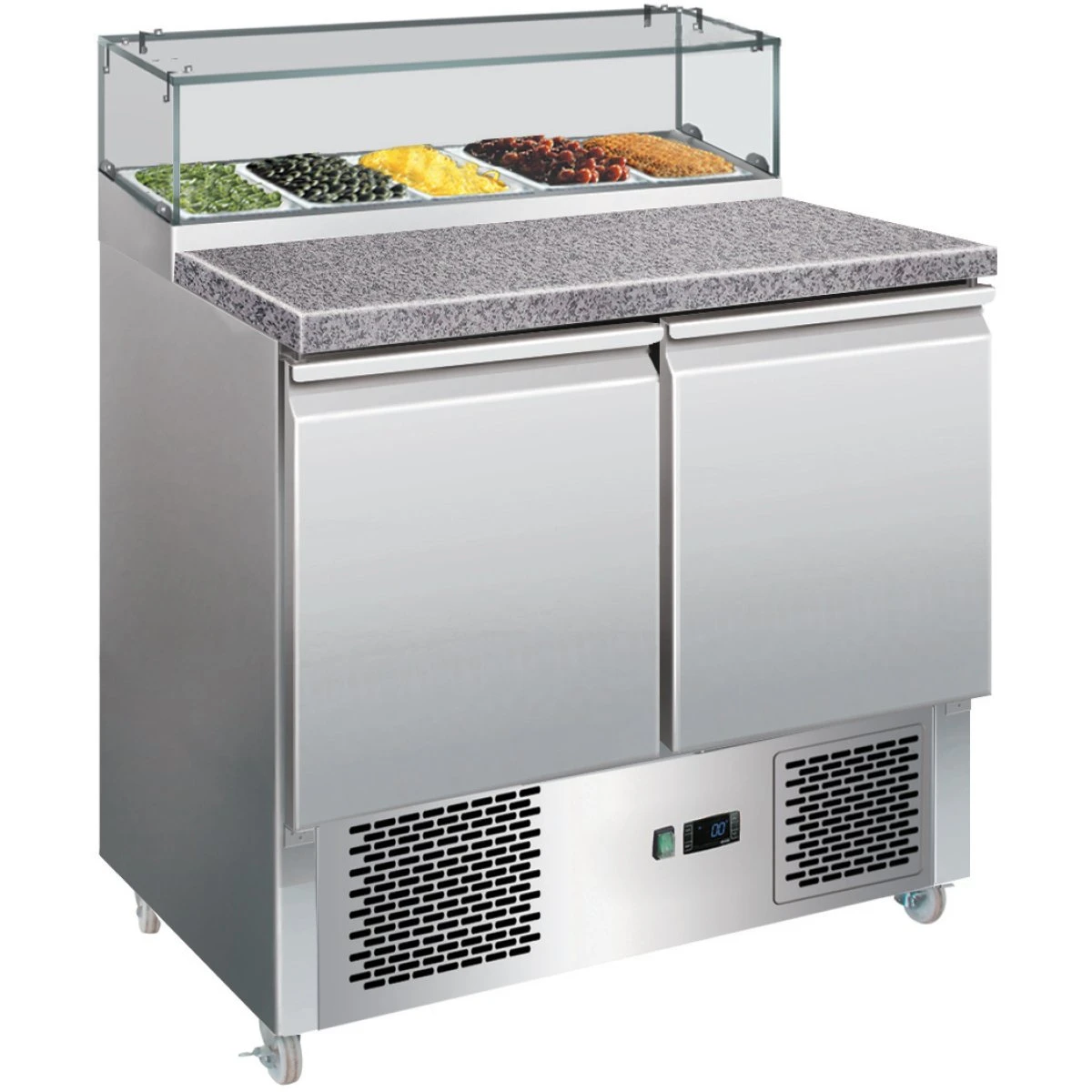 Professional preparation table ideal if you’re prepping pizza, sandwiches, wraps or salads, this refrigerated prep counter offers generous chilled storage and highly convenient rapid access to ingredients. The heavy duty marble countertop helps making pizza a breeze thanks to the cool, stick-resistant material. Inside, the fridge offers full size gastronorm pan compatibility, meaning you can quickly transfer food between restaurant appliances. A great quality catering prep fridge.