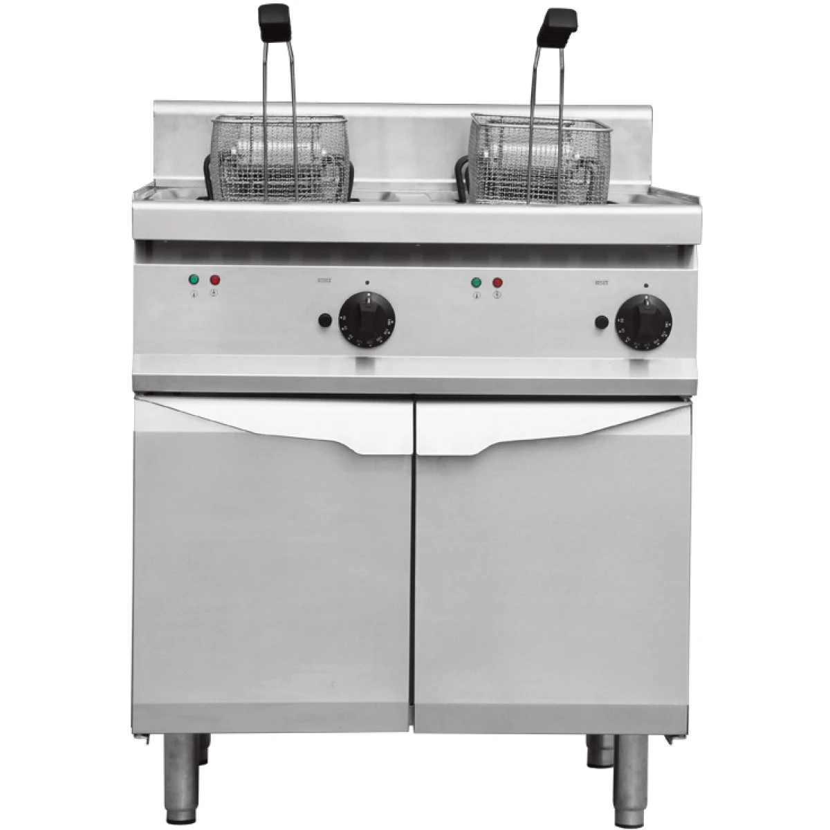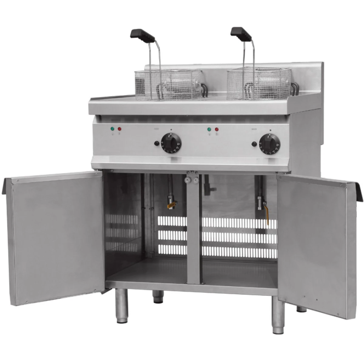 High capacity upright twin tank fryer perfect for bulk frying of large quantities of fries. Its hugh output, solid stainless steel construction makes this unit a great choice for busy chip shops, restaurants, bars, or for other high-volume catering applications. Whether you’re cooking fish, chips, onion rings or chicken, these high output fryer makes it much easier to keep up with demand.