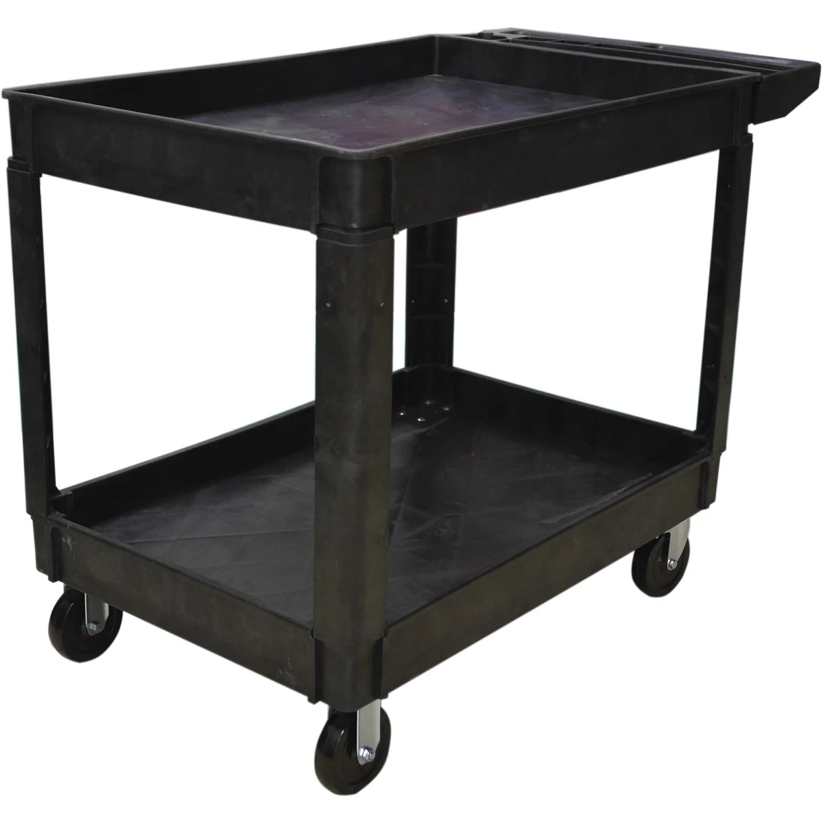 This commercial black multi-purpose utility cart combines front of the house appeal with back of the house durability. Featuring four swivel castors, two of which have brakes,