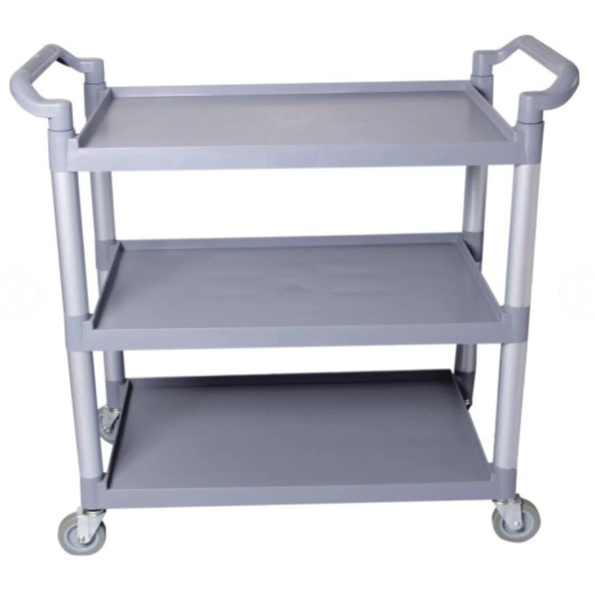 This commercial black multi-purpose utility cart combines front of the house appeal with back of the house durability. Sturdy, satin finished aluminum uprights provide exceptional support and minimize wear and tear from consistent usage. Featuring four swiver castors and brakes, this trolley can be transported with ease and safely locked in position. This versatile trolley can also be upgraded with the cutlery and refuse bin attachments (sold seperately), making this trolley practical for any restaurant, hotel or other catering establishment.