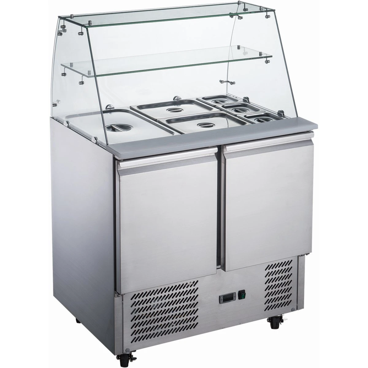 2 door glass top saladette refrigerator is just what you need for your cafe, sandwich shop, restaurant or any commercial kitchen. Made from the finest 304 grade stainless steel, it has three self closing doors to keep your produce fresh, food grade plastic preparation bench area and a stylish glass top that includes a shelf to store your non-perishable items. The saladette comes complete with castor wheels for easy maneuverability.