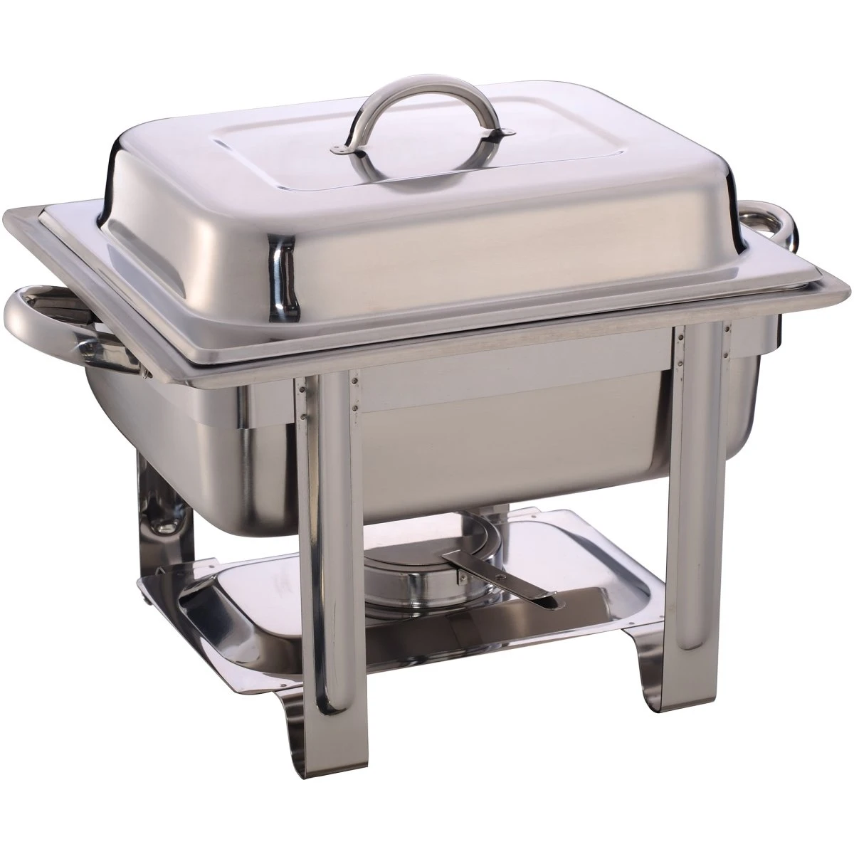A commercial stainless steel small sized professional chafer set with water pan, 4 litre food pan, cover and one fuel holder.