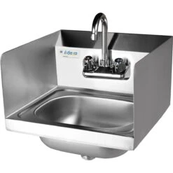 Keep your restaurant up to code without sacrificing space with this hand sink with a single bowl and a convenient high back splash. This easy-to-clean, compact sink easily fits in tight spaces and securely attaches to the wall or a surface to open up floor space for other uses. Its attractive, yet simple design will be sure to encourage cleanliness in the kitchen.